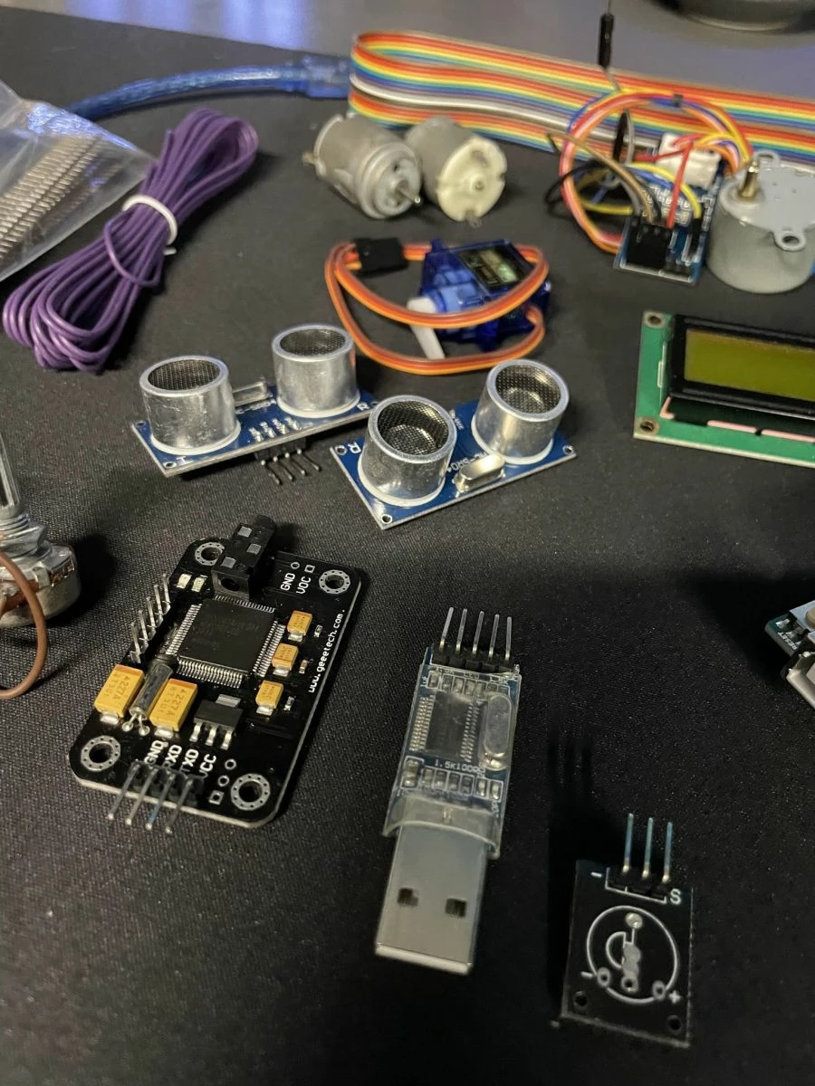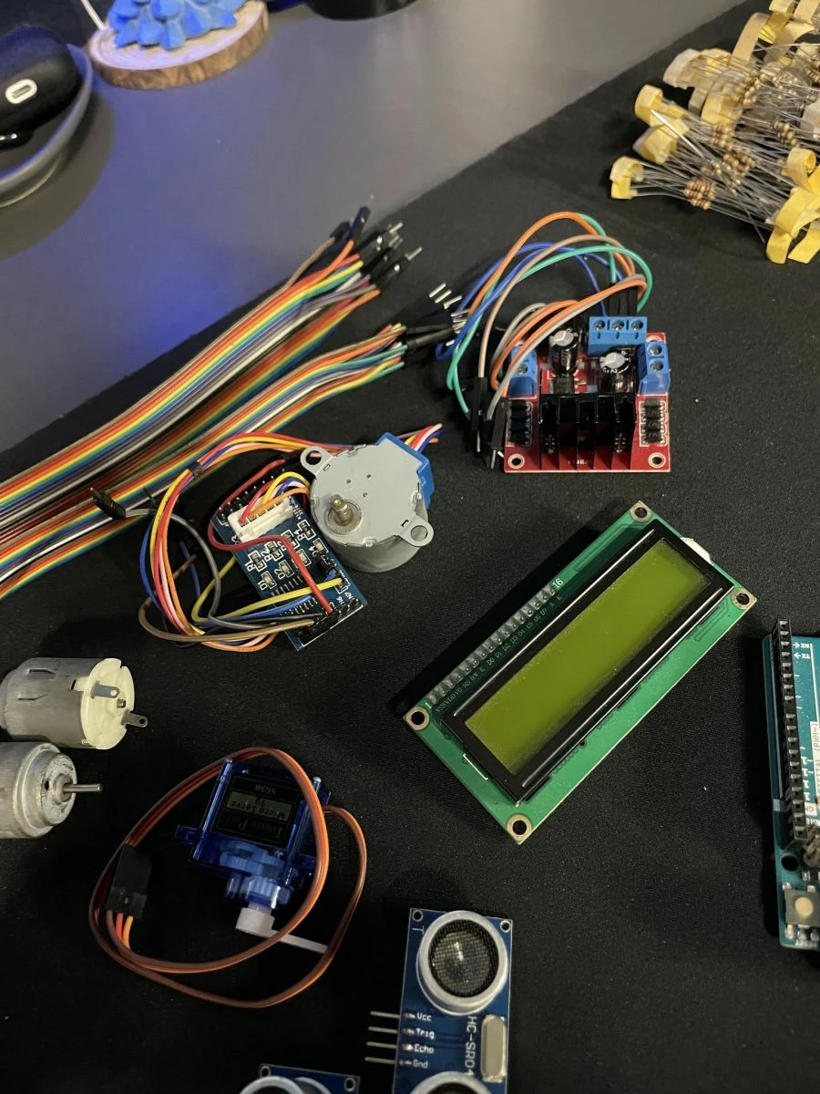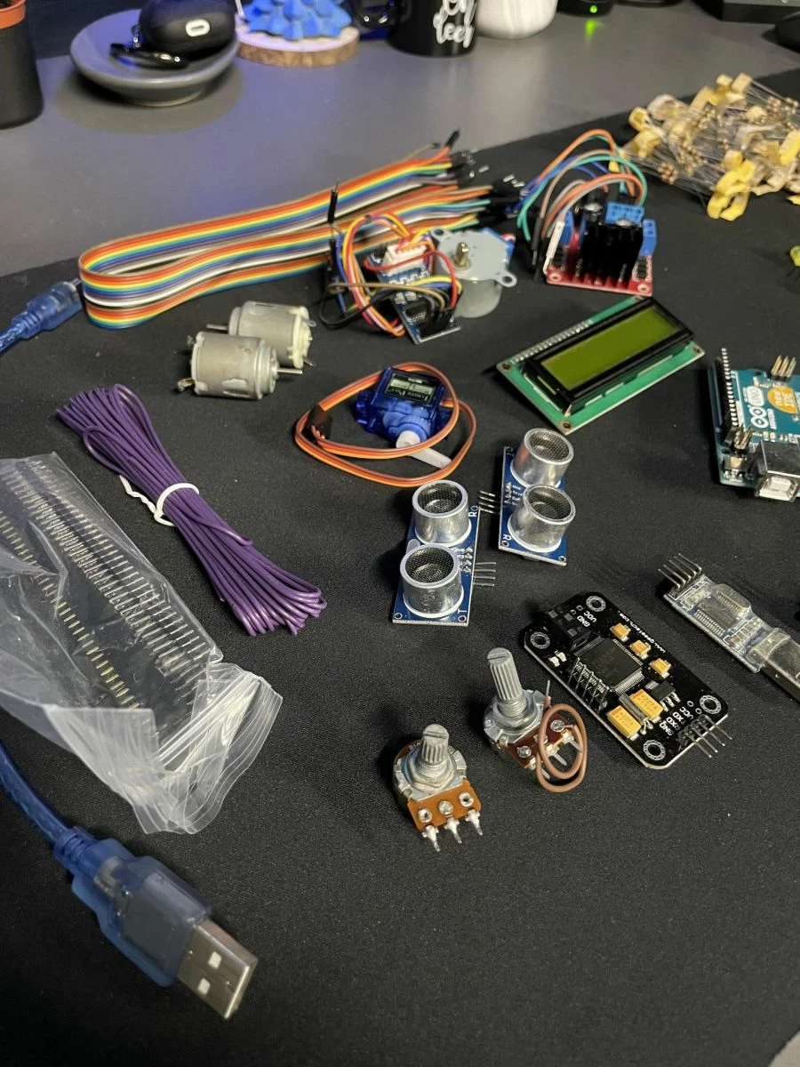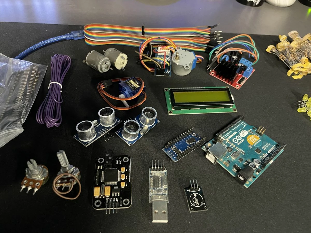 Πλήθος από αισθητήρες, led, controllers, αντιστάσεις, καλώδια, motors.