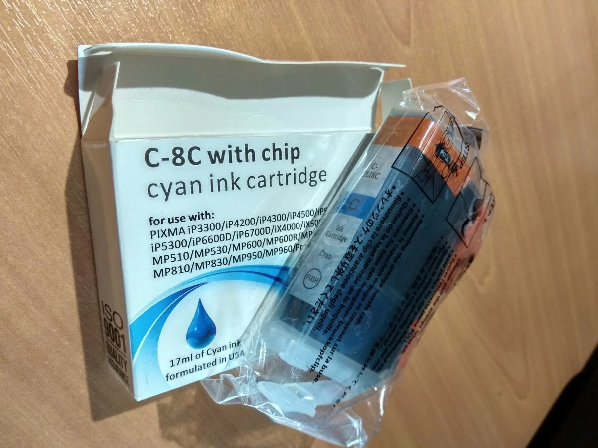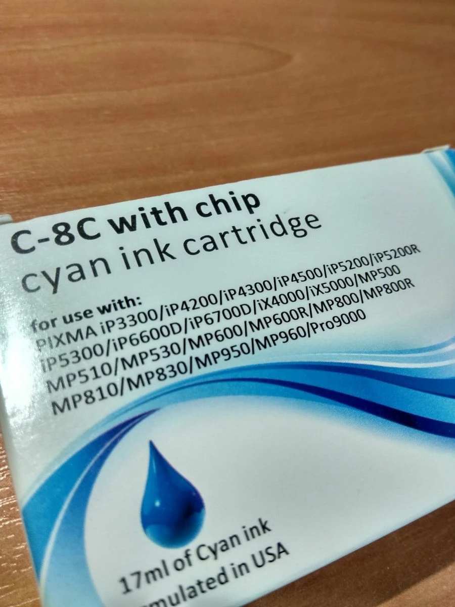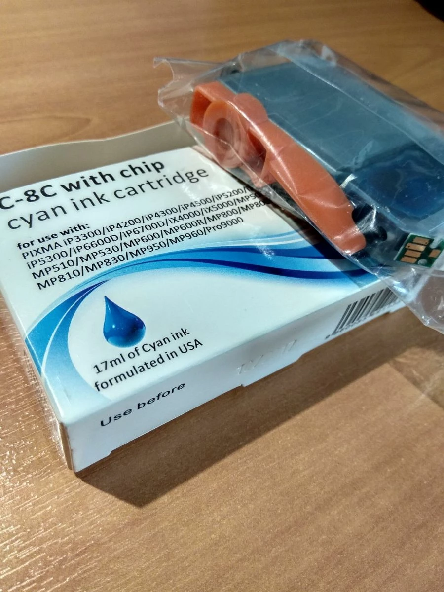 Αυθεντικό μελάνι Κυανό εντός της συσκευασίας και στο κουτί τους, για τους εκτυπωτές CANON που φαίνονται στις φωτογραφίες.