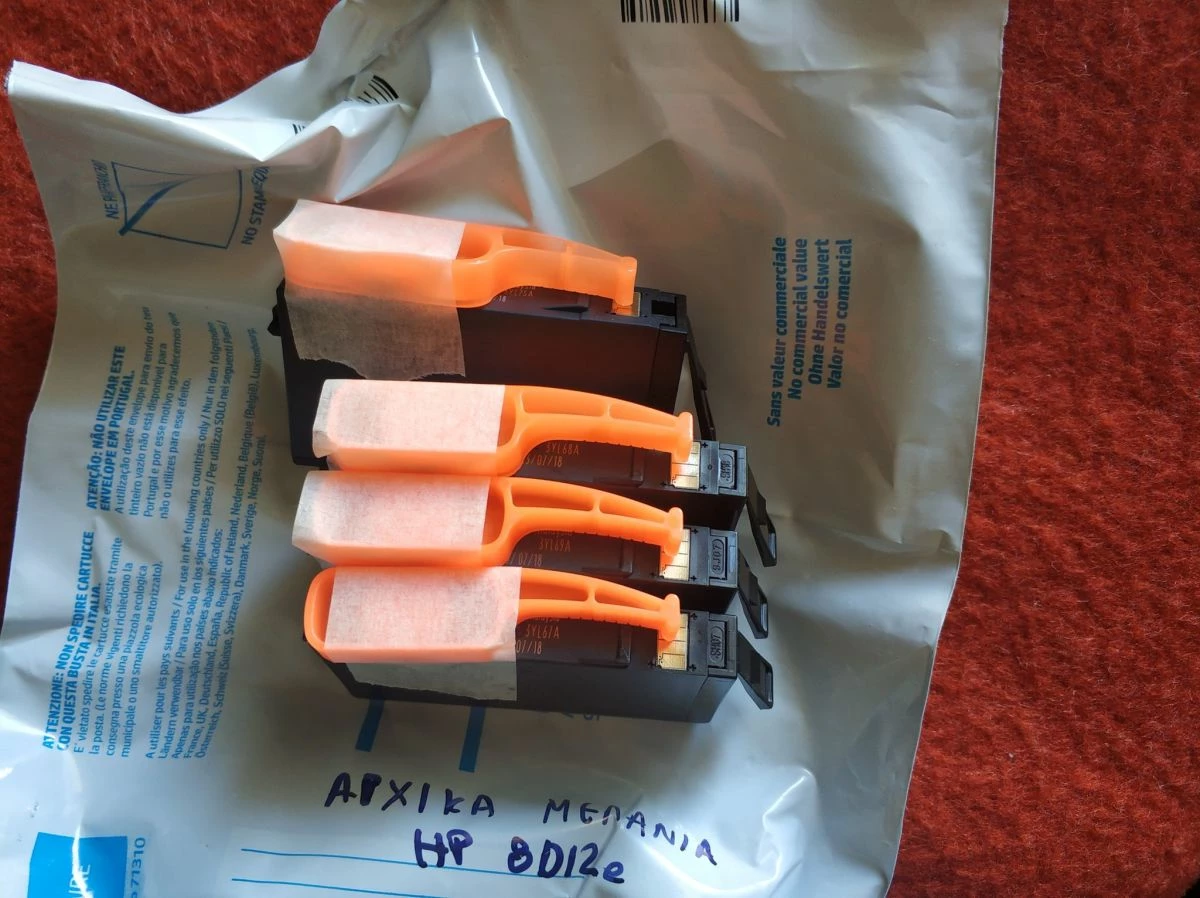 Μελάνια HP 912, ολόκληρο το σετ. Τα μελάνια αυτά ήρθαν μαζί με τον καινούριο μου εκτυπωτή και χρησιμοποιήθηκαν ίσα για να εκτυπώσω μερικές σελίδες για να διαπιστώσω την σωστή λειτουργία του εκτυπωτή. Ύστερα αλλάχθηκαν κατευθείαν γιατί μπήκα στο πρόγραμμα HP Instant ink το οποίο έχει ειδικά μελάνια. Όταν τα έβγαλα τους έβαλα κατευθείαν καπάκια στο σφουγγαράκι που κατεβάζει το χρώμα. Είναι σε άριστη κατάσταση και γεμάτα. 20 ευρώ είναι για όλο το σετ.